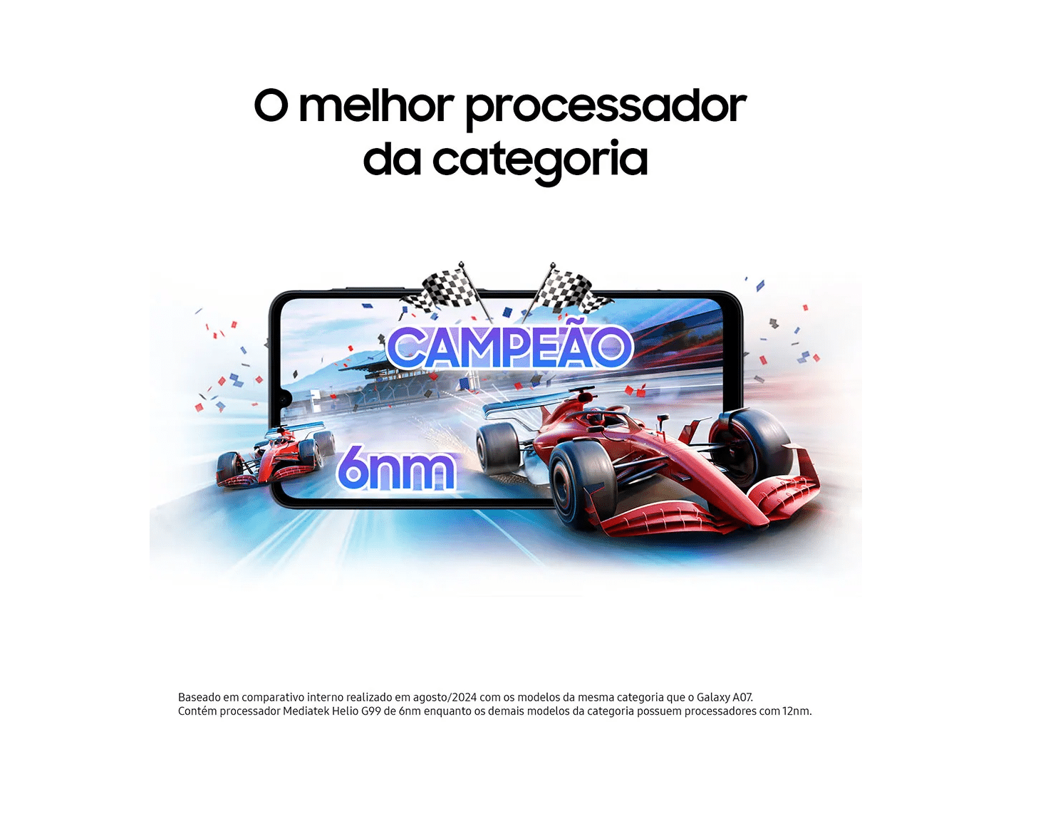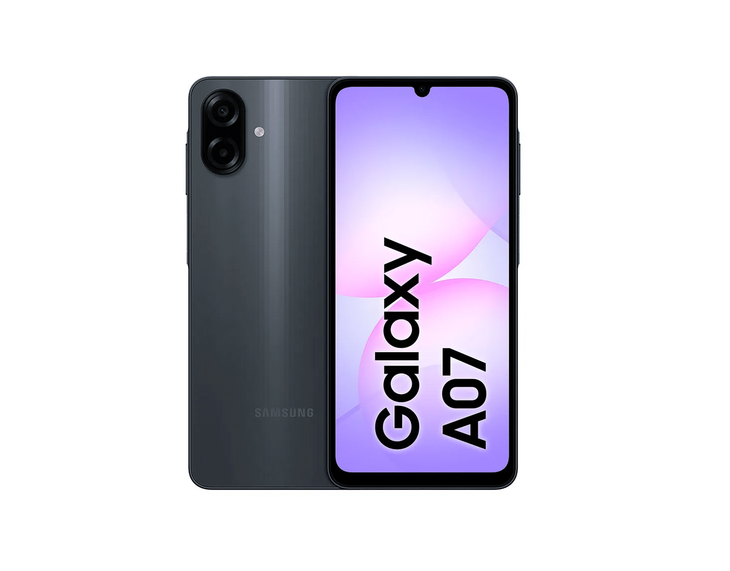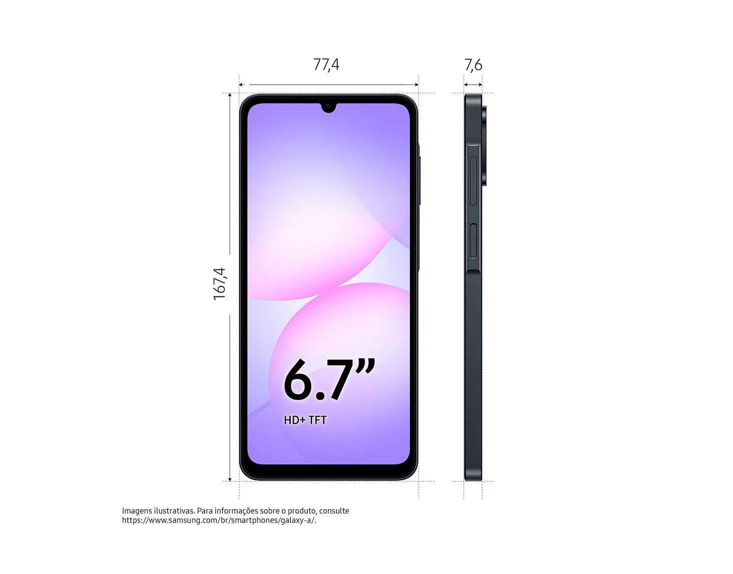 O Galaxy A07 128GB traz 4GB RAM + RAM Plus, processador Helio G99 (6nm), câmera dupla até 50MP, selfie de 8MP e tela de 6,7″ HD+ 90Hz. Também possui bateria de 5000mAh e proteção IP54.