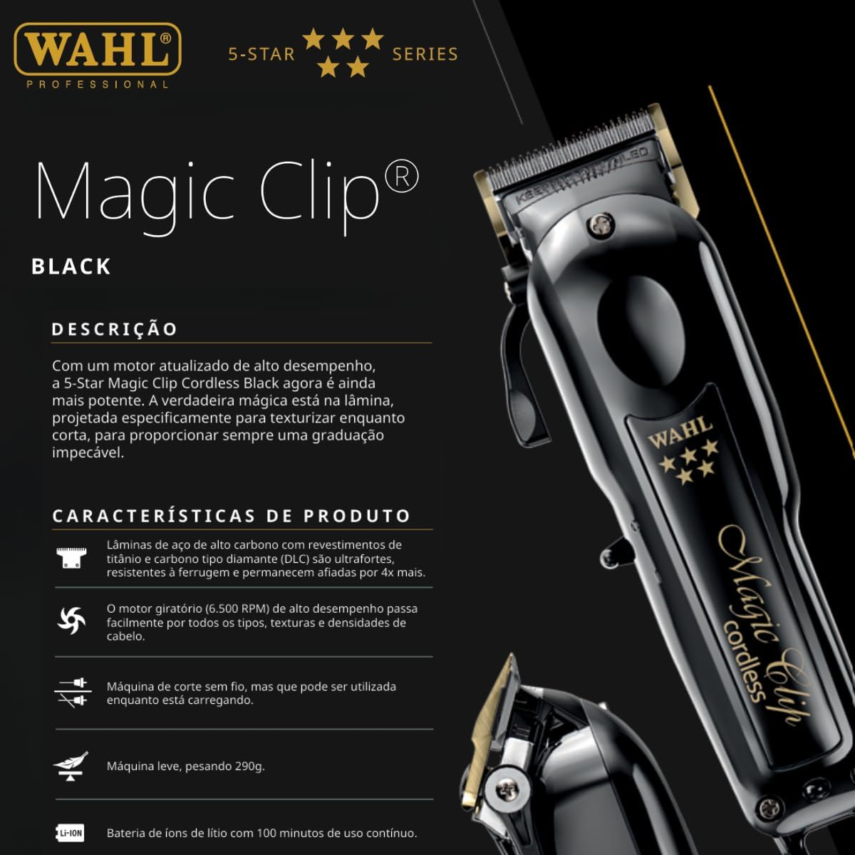 A Wahl Magic Clip Preta é uma ferramenta profissional de alta performance, projetada para proporcionar cortes precisos e rápidos, seja em salões de beleza ou no uso doméstico. Seu design sofisticado na combinação de preto e dourado confere um visual elegante, enquanto a sua tecnologia de ponta oferece resultados excepcionais em todos os tipos de cabelo.